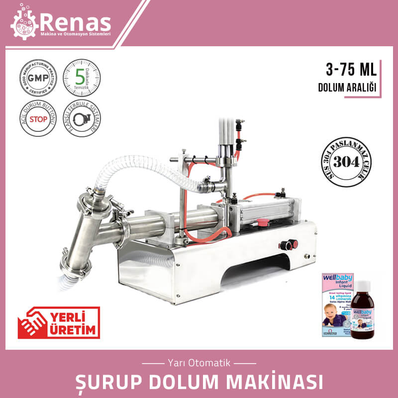 The syrup filling line is a professional filling solution designed to accurately and consistently fill liquid and semi-viscous syrups using a pneumatic (compressed air) system. It is widely preferred in the food, pharmaceutical, supplement, and chemical industries. Suitable for filling fruit syrups, flavored syrups, glucose syrup, medicinal syrups, and other viscous products, the system is available in manual or semi-automatic models. It is an ideal solution for small and medium-sized production facilities, offering low investment cost, ease of use, and simple maintenance. Thanks to its pneumatic operating principle, energy consumption is minimized while ensuring safe and stable filling performance. Its operator-friendly design provides high filling accuracy and compliance with hygiene standards.